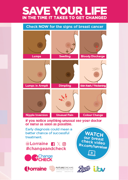 Claire Nevinson, Superintendent Pharmacist at Boots, said: “We are thrilled to support the ITV Lorraine Change + Check campaign. It is such a simple prompt for everyone to self-check and be aware of the signs and symptoms of breast cancer. At Boots, we’re with you for life, and that includes at your most difficult times, so if anyone has any questions or concerns about cancer, please come and talk to one of our expert colleagues in store.”